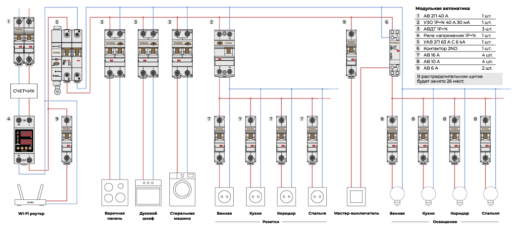 * Схема не является руководством для монтажа. В каждом случае должна разрабатываться профессиональным электриком индивидуально. Заземляющий провод опущен для простоты восприятия.
