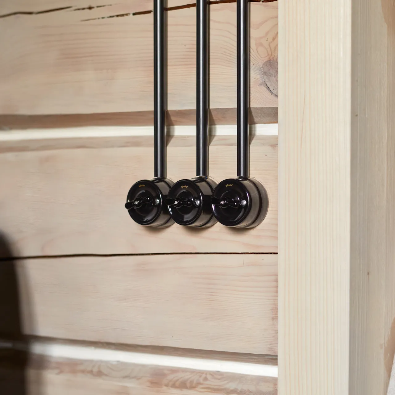 На видных местах разместили накладные механизмы из коллекции Retro Werkel в стильном черном исполнении. Их керамические корпуса и поворотные ручки вместо клавиш стали ярким акцентом интерьера, подчеркивая уникальность деревянного дома. Поскольку в таком доме невозможно сделать штробы, провода спрятали в специальные трубы, стилизованные под старину, что дополнило общую концепцию дизайна .